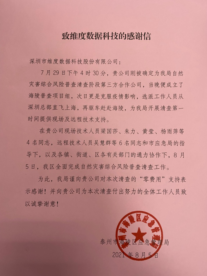 8月5日,深圳市维度数据科技股份有限公司(以下简称“维度数据科技”)收到了泰州市海陵区应急管理局发来的感谢信。 在此,感谢泰州市海陵区应急管理局对维度数据科技信任和对项目组清查工作的肯定与认可!团队将继续秉承科技引领、融合发展的理念,践行专业专注、艰苦奋斗、追求卓越的价值观,致力为第一次全国自然灾害综合风险普查工作提供更加优质高效的产品服务和解决方案,帮助客户高质量完成普查任务。