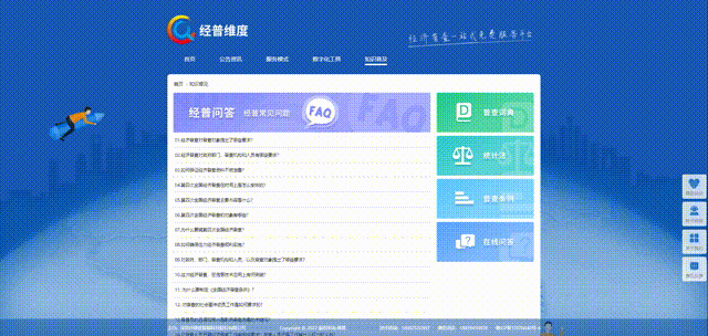 “经普维度”平台除首页外,包含公告资讯、数字化工具、服务模式、知识普及四大板块,涉及数十个功能页面。